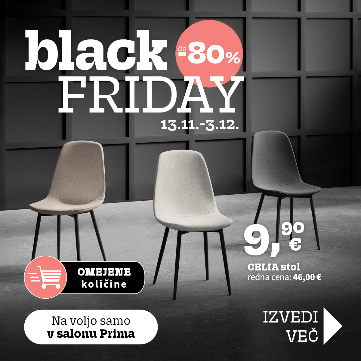 Začel se je Black Friday v Prima salonih in na spletni trgovini!  Od 13.11. do 3.12. izkoristite največje letošnje popuste do kar 80% na izbran asortiman pohištva in dekoracij. V novem letaku vas čaka bogata ponudba po super cenah in posebni izdelki z neverjetnimi popusti. Ne zamudite priložnosti za pameten nakup.