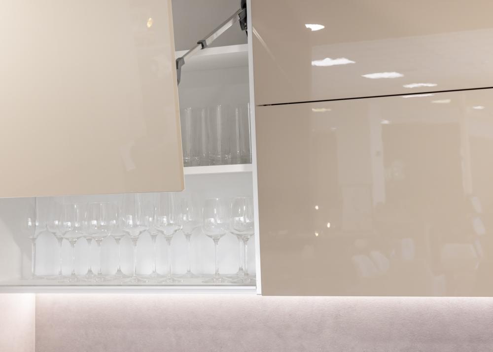 Zgornje elemente številni odprejo z rahlim pritiskom na fronto – to je t. i. tip-on mehanizem, ki ne zahteva ročaja in še dodatno poudari minimalistično estetiko.