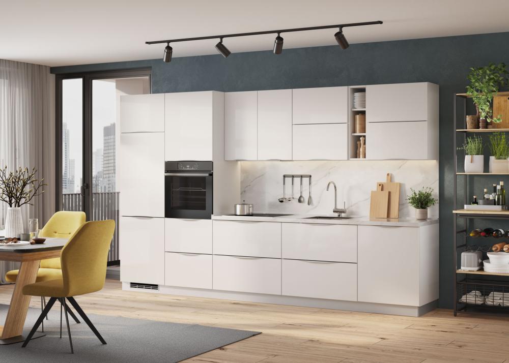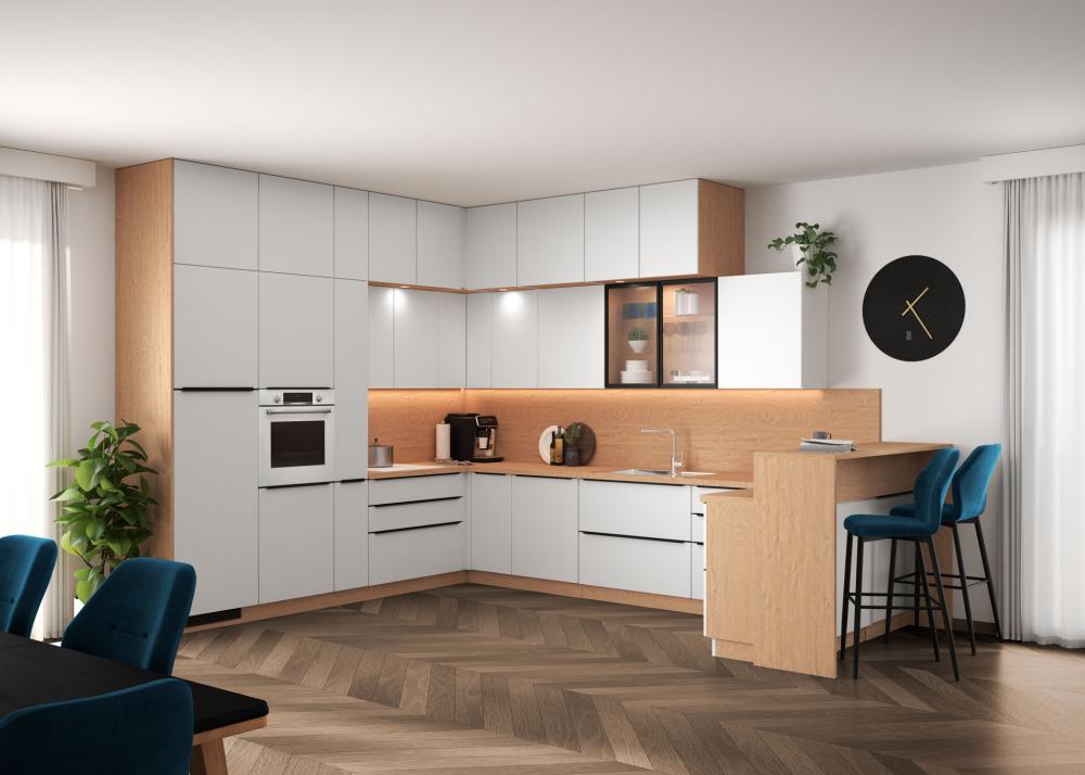 V mat izvedbi delujejo bele fronte mehko, elegantno in sodobno – idealno za vse, ki prisegajo na tihi luksuz. Bela kuhinja v visokem sijaju pa dodatno poudari svetlobo ter prostoru doda pridih glamurja in sodobnosti, kar še posebej dobro deluje v manjših prostorih, kjer vizualno poveča volumen.