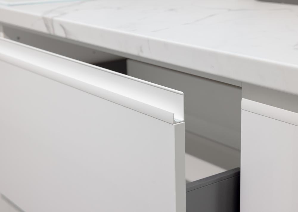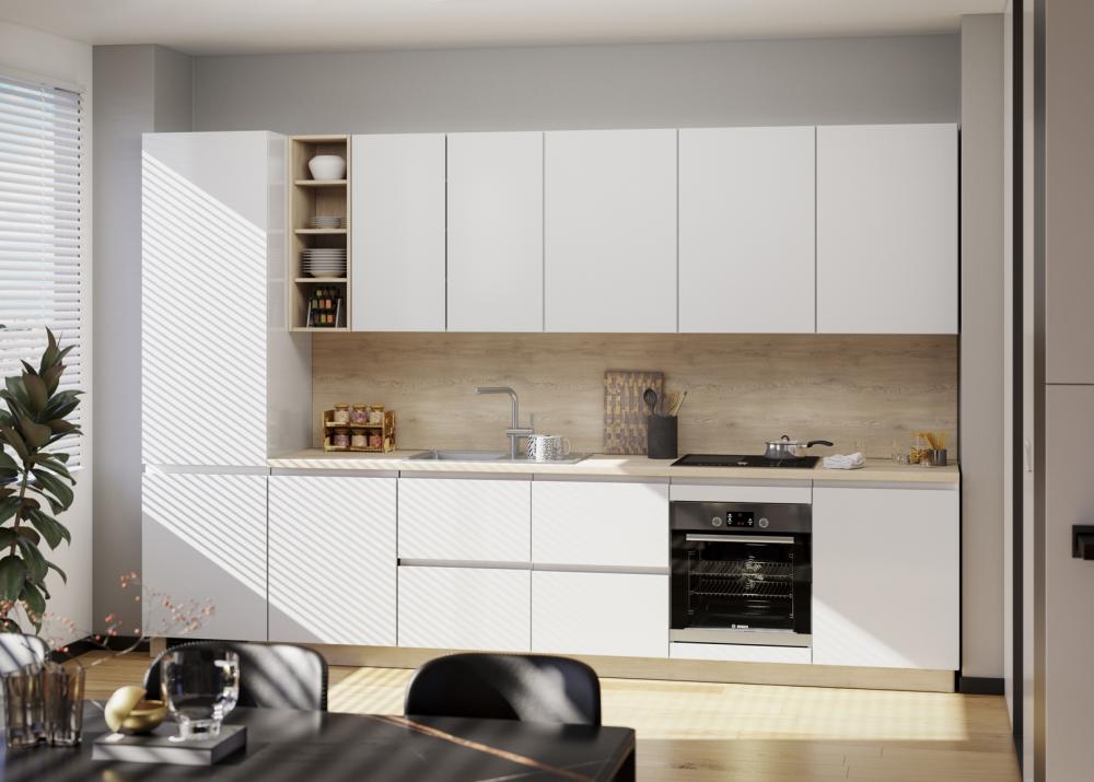 Kristalno bela barva v kuhinji ustvari občutek čistoče, reda in umirjenosti. Vizualno odpira prostor, odbija svetlobo in naredi kuhinjo večjo ter zračnejšo. Psihološko deluje pomirjujoče, nevtralno in organizirano – popolno za prostor, kjer preživimo veliko časa.
