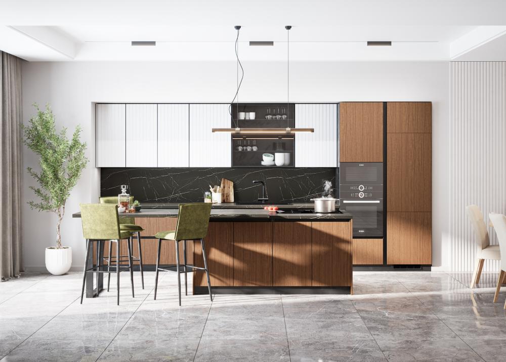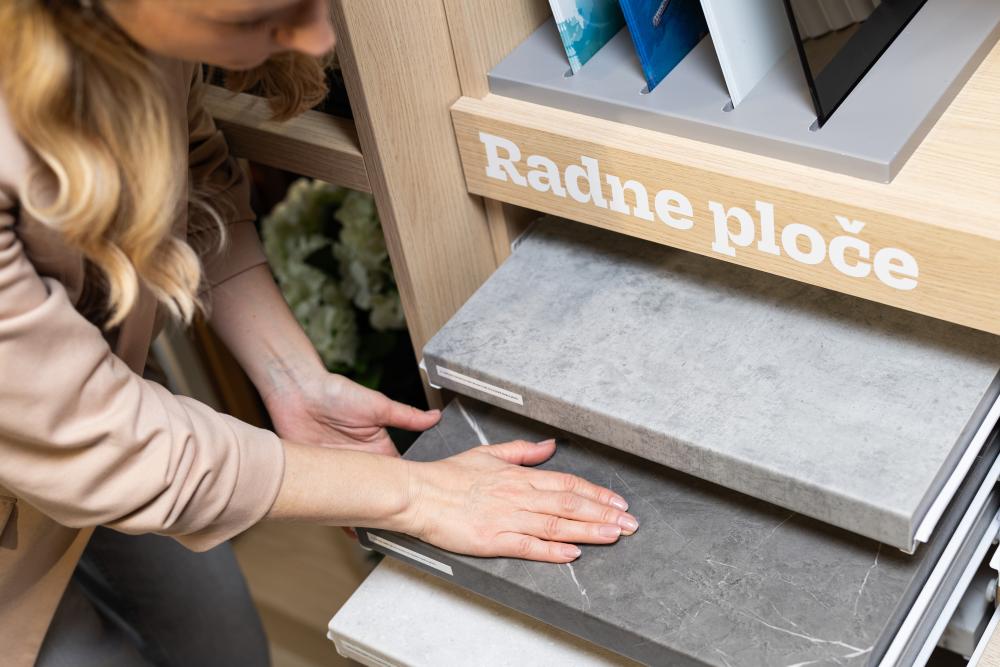 kamnitimi ali keramičnimi delovnimi površinami v videzu marmorja, za prefinjen in luksuzen vtis