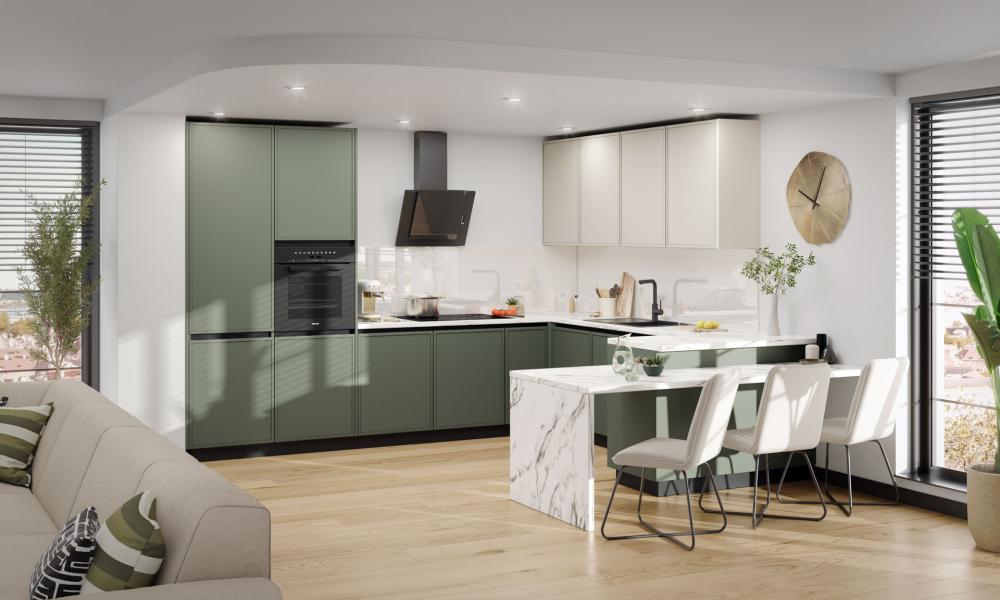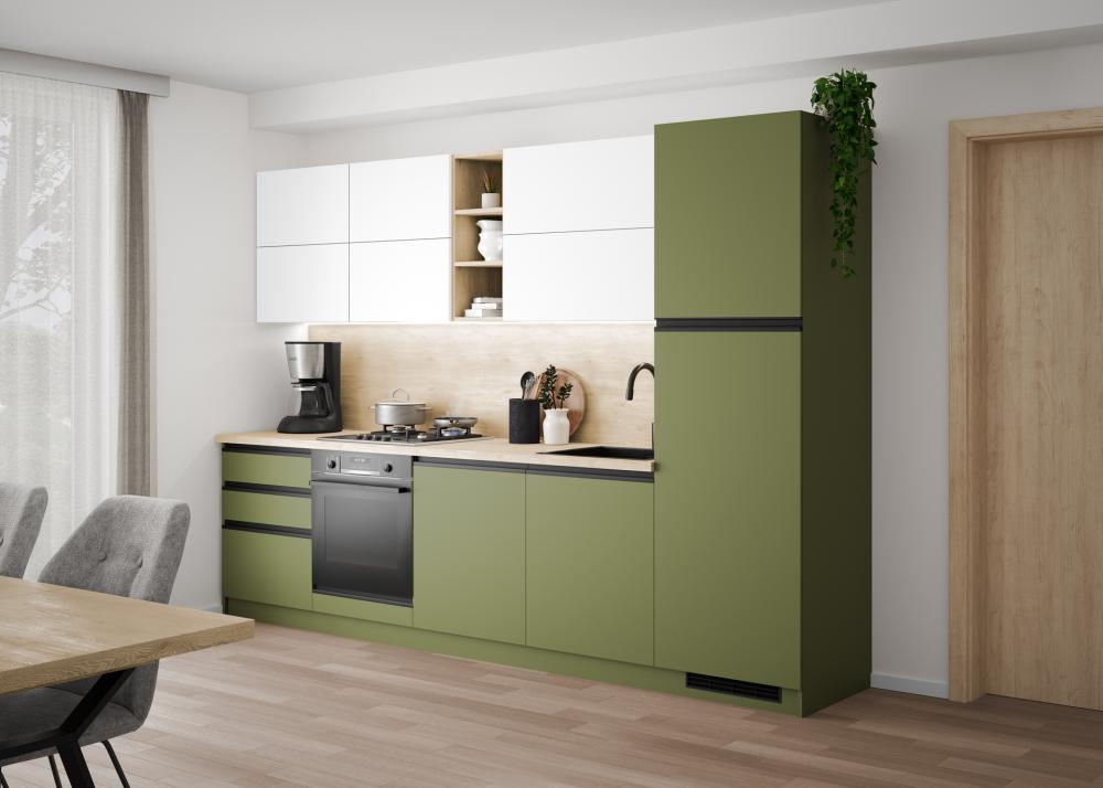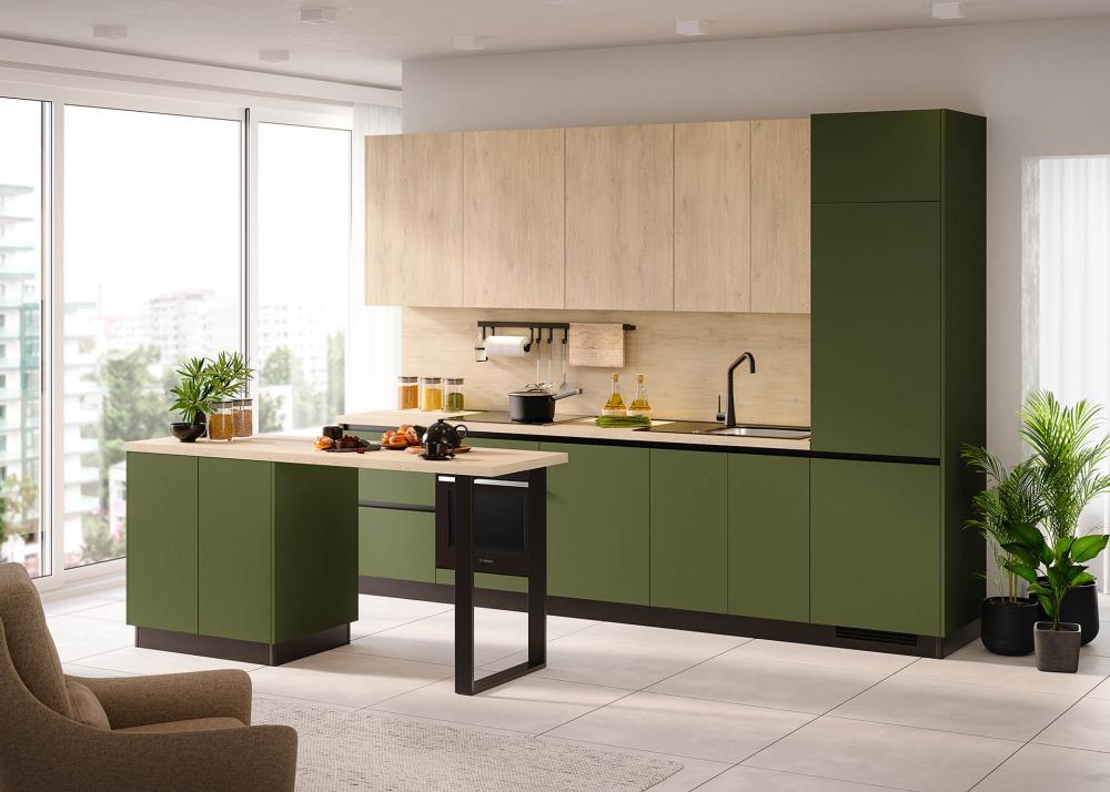 Za razliko od prehodnih barv, ki trendovsko prihajajo in odhajajo, kot je peach fuzz, je zelena postala ena najbolj iskanih barv kuhinjskih elementov prav zato, ker daje občutek umirjenosti, naravnega ravnotežja in prilagodljivosti.