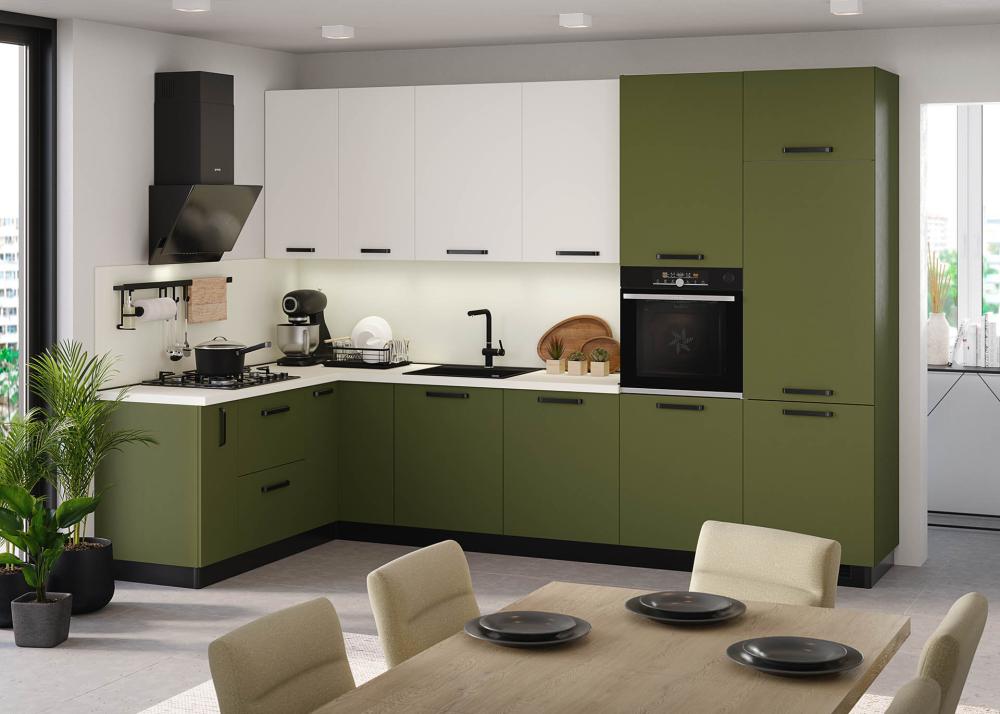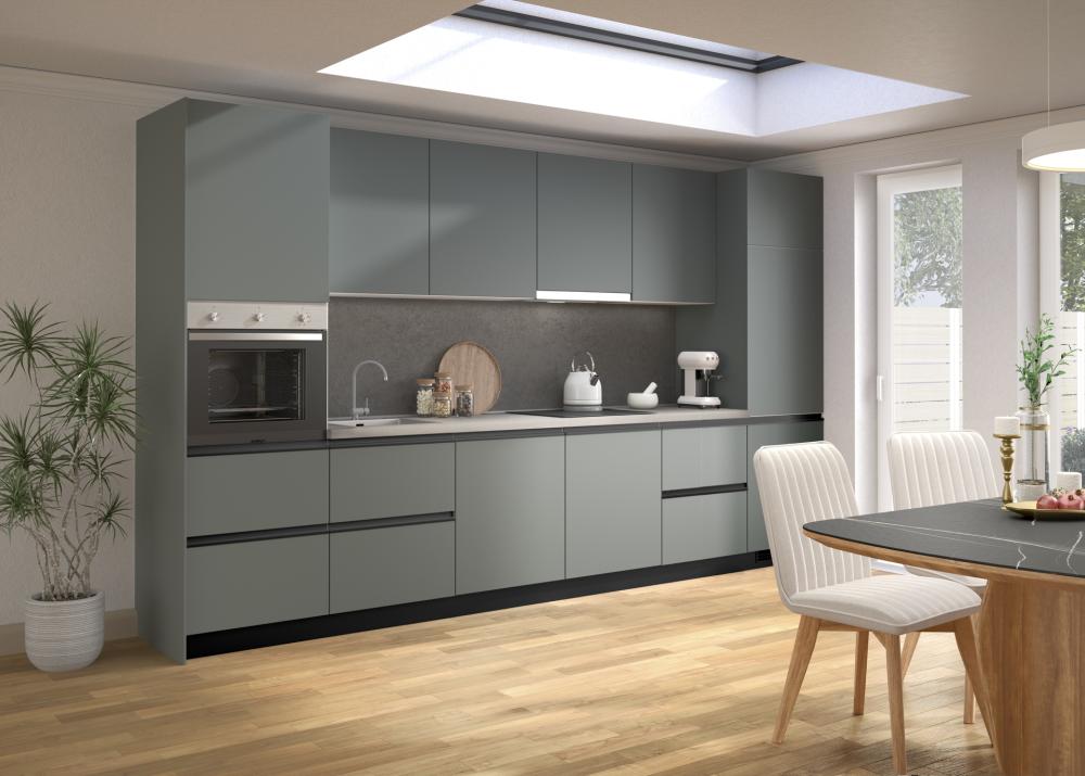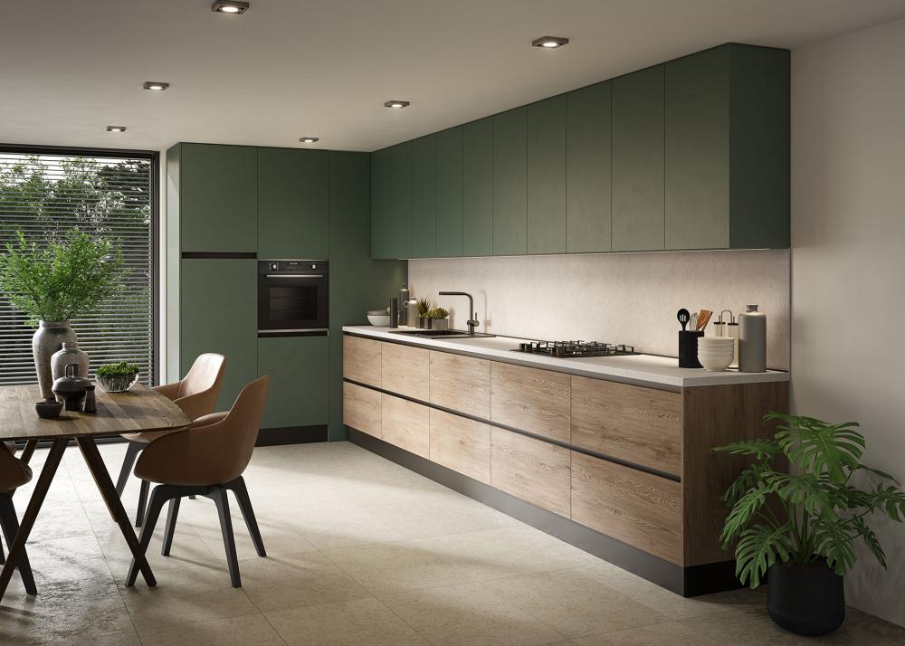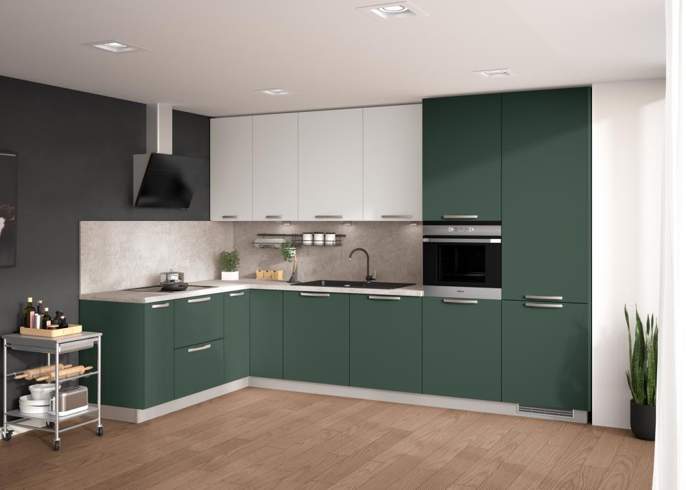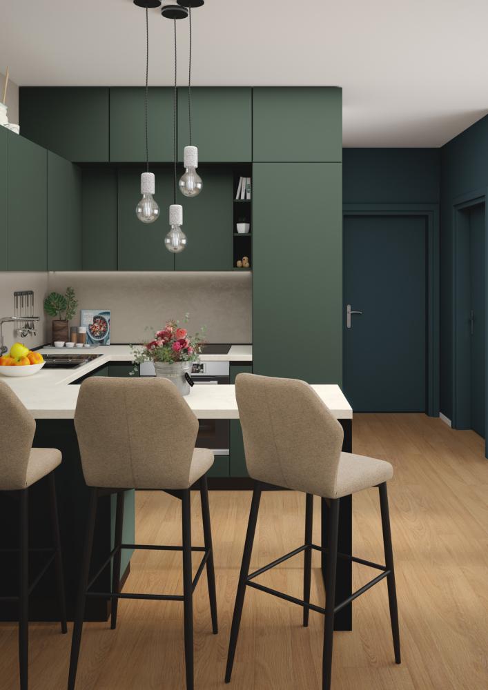 Med najbolj priljubljenimi odtenki so črno-zelena temna, gorsko zelena, mah zelena, pistacija in žajbljeva zelena – vse zasnovane tako, da v srce doma – kuhinjo – vnesejo globino in osebnost.