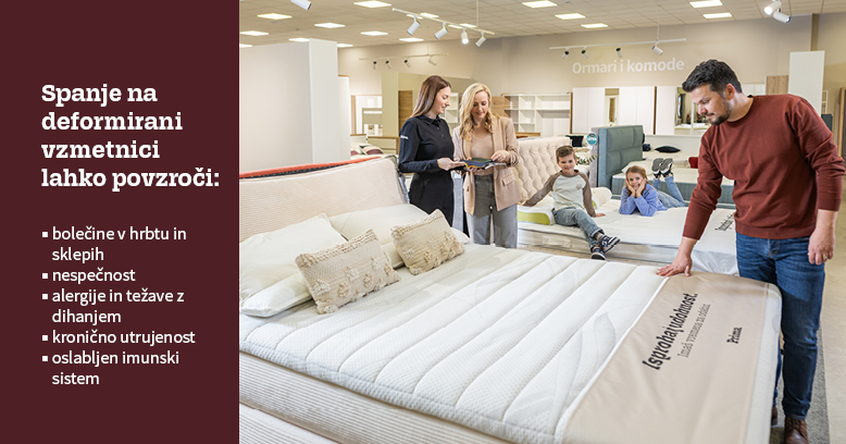 Zamenjajte vzmetnico, preden bo prepozno! Z zdravjem se ne igramo. Poleg prahu, pršic in bakterij stare vzmetnice postanejo neudobne in vsak dan ogrožajo vaše zdravje. Kakovosten spanec je ključen za obnovo telesa, močnejši imunski sistem, hormonsko ravnovesje in duševno zdravje. Če spite slabo, se telo nikoli ne regenerira popolnoma – posledice občutite vsak dan.