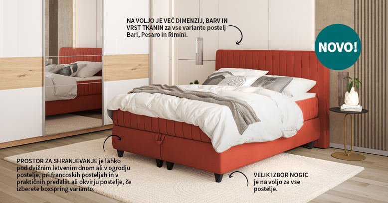 Začnite z modernim vzglavjem, nato izberite različico postelje, ki vam ustreza. Boxspring z predalom ali prostorom za shranjevanje, francoska ali postelja z dvižnim letvenim dnom, z vzmetnico ali brez – vse je mogoče! Vzglavje Bari z navpičnimi šivi spodbuja dinamiko v prostoru, Pesaro s kvadratnimi detajli izžareva preprostost, medtem ko Rimini na vzglavju uporablja diamantne šive, ki vnašajo luksuz.