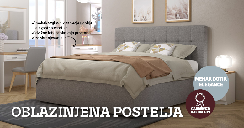 Oblazinjena postelja vnaša občutek mehkobe, topline in elegance v prostor. Tkanina in barva dodatno poudarjata slog sobe, vzglavje pa postane dekorativen, a hkrati funkcionalen element, ki postelji daje vizualno razkošje.