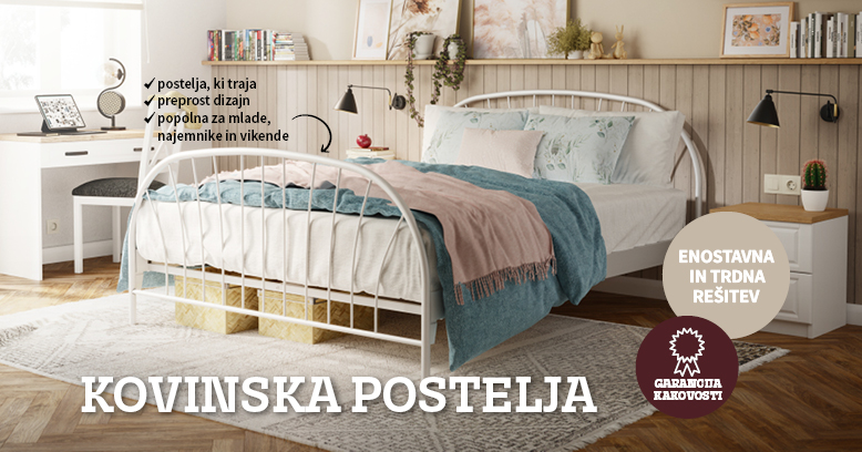 Kovinska postelja vnaša občutek lahkotnosti in preprostosti v prostor. Pogosto je v črni ali beli kovinski barvi, kar jo naredi zelo enostavno za kombiniranje – poda se k pohištvu vseh barv in materialov. Odlična je v kombinaciji z nevtralnimi toni in naravnimi dekorji, pa tudi z živahnimi, veselimi kombinacijami, idealnimi za sobe za mlade.