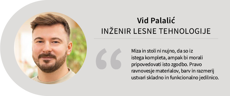 Za skladen videz prostora je pomembno, da so materiali stolov in mize med seboj povezani. Če je miza iz masivnega hrastovega lesa, izberite stole z lesenimi nogami v enaki obdelavi, ki bodo poudarili naravno toplino prostora. Če imate mizo s kovinskim podnožjem v črni ali inox obdelavi, so odlična izbira stoli z enako obarvanimi kovinskimi nogami – tako boste prostoru dodali prefinjenost in slogovno zaokroženost.