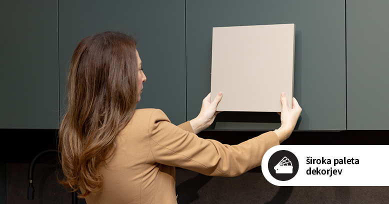 Izberite svojo idealno kombinacijo front iz širokega spektra barv in dekorjev ter detajle v lesnem ali kamnitem dekorju za delovno ploščo, podnožje in stranice elementov. Izberite tudi notranjost kuhinje oziroma barvo korpusa iz palete treh dekorjev – bela, temni ali svetli tekstil.