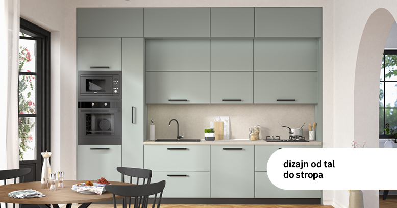 Čar kuhinj po meri je v tem, da se lahko popolnoma prilagodijo dimenzijam vašega prostora in vašim željam. Vsak model kuhinje, ki ga vidite, je lahko v večji ali manjši postavitvi. Kuhinja se lahko razteza vse do stropa. Z izbiro dodatnih globokih zgornjih elementov boste izkoristili vsak centimeter vertikalnega prostora – idealno za shranjevanje stvari, ki jih ne uporabljate vsak dan.