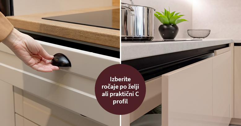 Vgradni, nadgradni, klasični, školjkasti, okrogli retro… Ponujamo širok izbor ročajev, vi pa izberete tiste, ki kuhinji dajejo stilski pečat. Moderna in pogosto iskana možnost je C profil na spodnjih elementih namesto klasičnih ročajev. Prispeva k minimalističnemu videzu kuhinje in olajša čiščenje front.