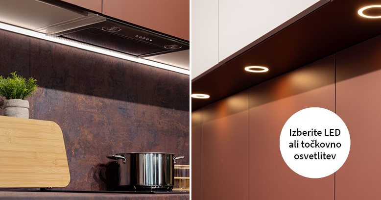 Posebno vzdušje v svojo novo kuhinjo vnesite z različnimi vrstami vgradne osvetlitve, ki je lahko nameščena pod zgornjimi elementi ali v steklenih omaricah. Vgradna LED ali točkovna osvetlitev bo olajšala vse vaše kuharske dogodivščine – tudi v večernih urah.