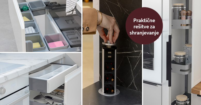 Podrobnosti zaokrožijo dizajn vaše kuhinje, tudi če so skrite – kot so praktične rešitve za shranjevanje in organizacijo. Izberite vtičnico, ki izgine v delovni plošči, ko je ne uporabljate, ali plitvo skrito notranjo predalo znotraj globokega zgornjega predala – idealno za pribor. Skrite koše za ločevanje odpadkov so rezultat okoljsko odgovornega dizajna kuhinje, zelo praktičen pa je tudi vertikalni izvlečni element, ki ga lahko opremite kot shrambo na dosegu roke.