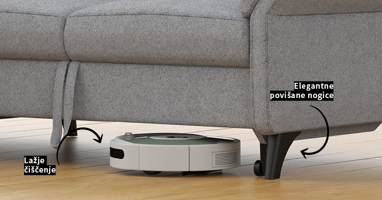 Vse bolj prevladujejo sedežne garniture z višjimi nogicami, ki prostoru dajejo zračnost in eleganco. Poleg estetskega učinka ta dizajn olajša čiščenje – še posebej ob uporabi robotskega sesalnika. Kovinske nogice dajejo sodoben industrijski videz, lesene pa toplino in naravni občutek.