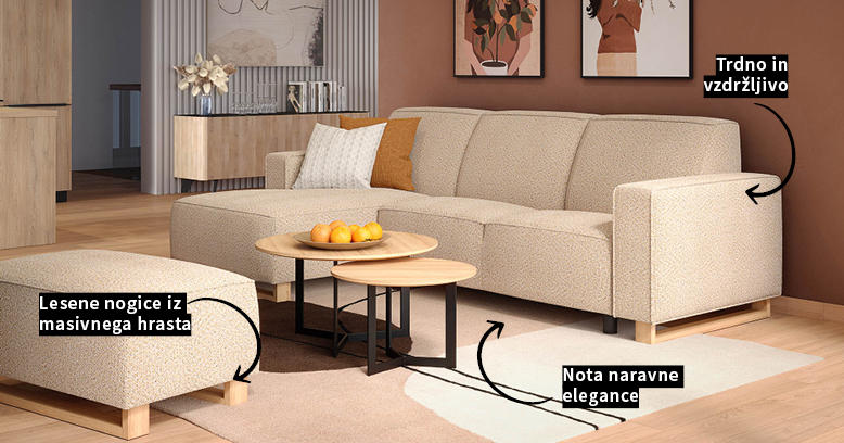 Nogice iz masivnega bukovega ali hrastovega lesa prinašajo toplino v prostor, hkrati pa zagotavljajo trdnost in dolgo življenjsko dobo. Konstrukcija iz masivnega bukovega lesa daje stabilnost, naravne teksture lesa pa ustvarjajo pomirjujoč in organski videz. Za skladen interier dopolnite sedežno garnituro s komodami, regali in mizicami v istem dekorju.