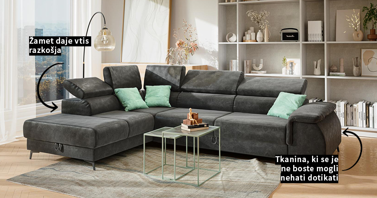Žamet je material, ki prinaša eleganco in mehkobo, njegova nežna tekstura pa vsako sedežno garnituro naredi za pravi statement kos. Izberite temnejše odtenke, ki prostoru dajejo prefinjen videz. Poleg razkošnega videza je žamet tudi prijeten na otip – popoln za trenutke sprostitve.